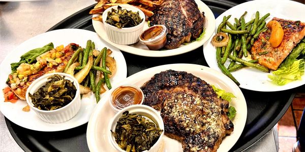 Big Papa's Rib Eyes, Smoked Peach Glazed Salmon